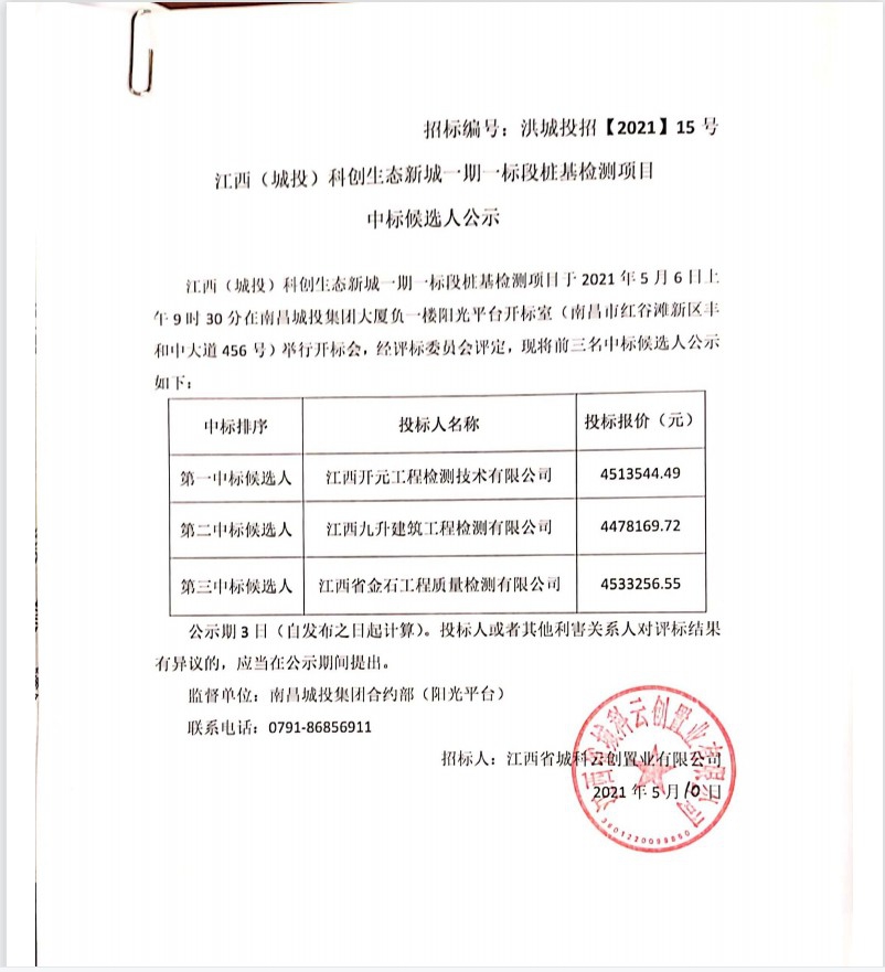 江西(城投)科创生态新城一期一标段桩基检测项目中标候选人公示
