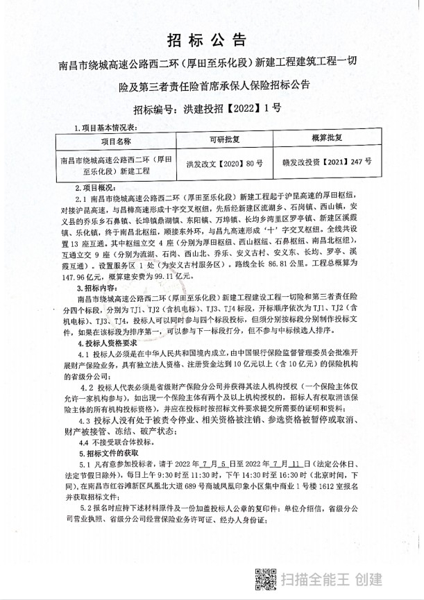 南昌市绕城高速公路西二环(厚田至乐化段)新建工程修建工程一切险及圈外人责任险首席承保人包管招标通告