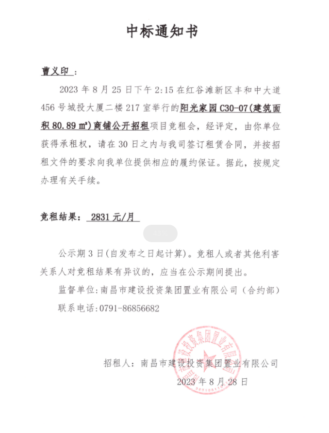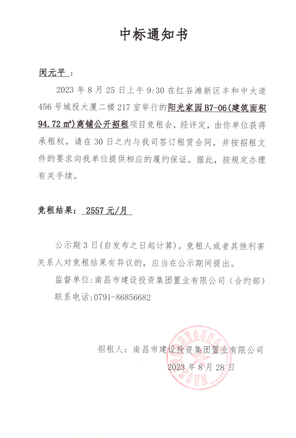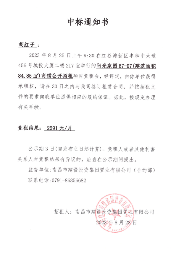 中标通知书(阳光家园租赁条约到期商铺租赁项目(一)23份)